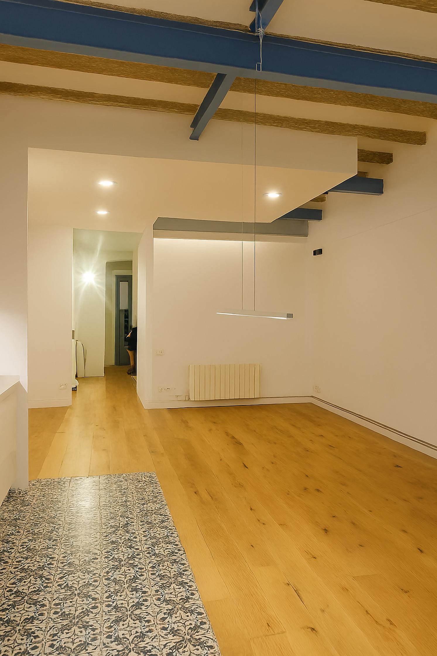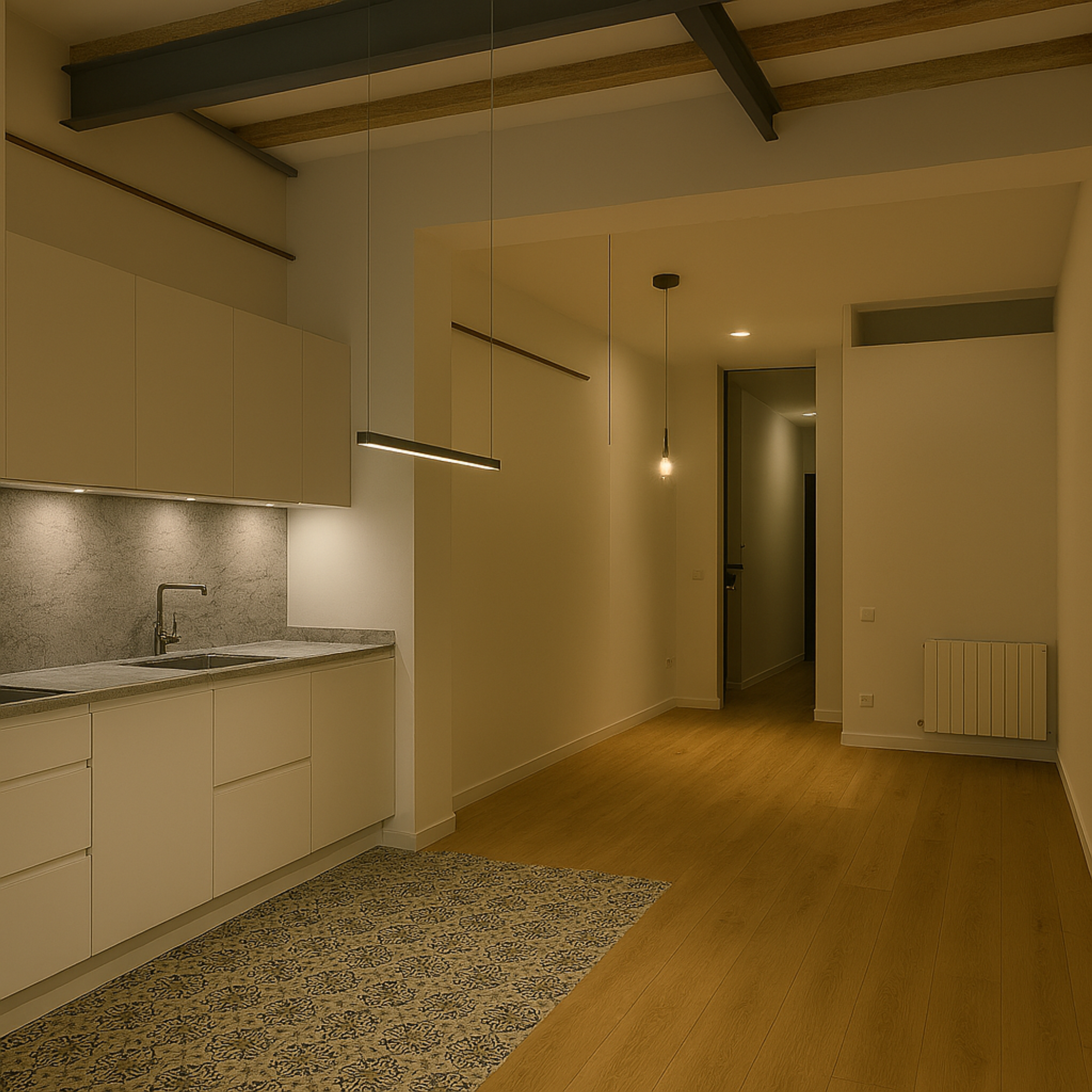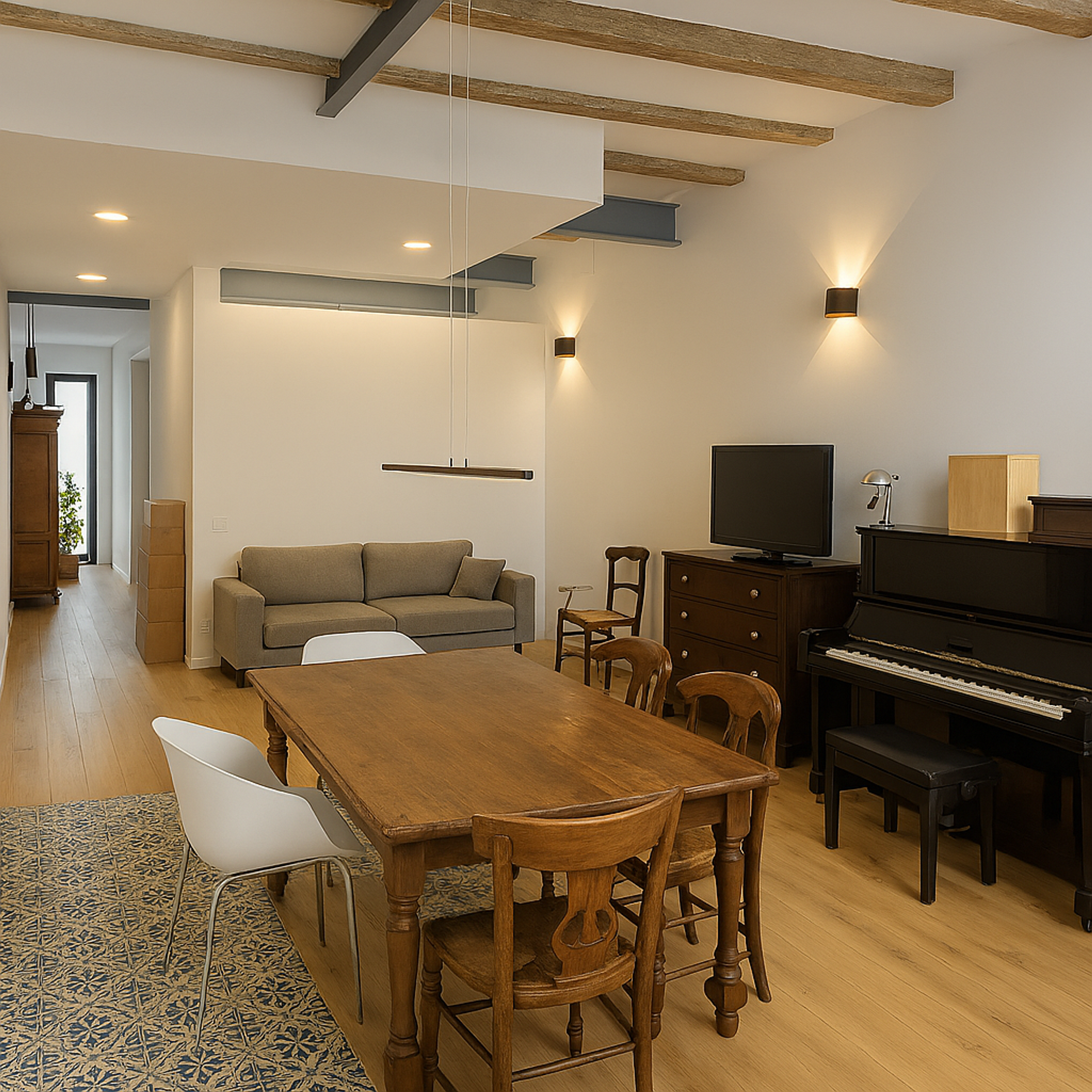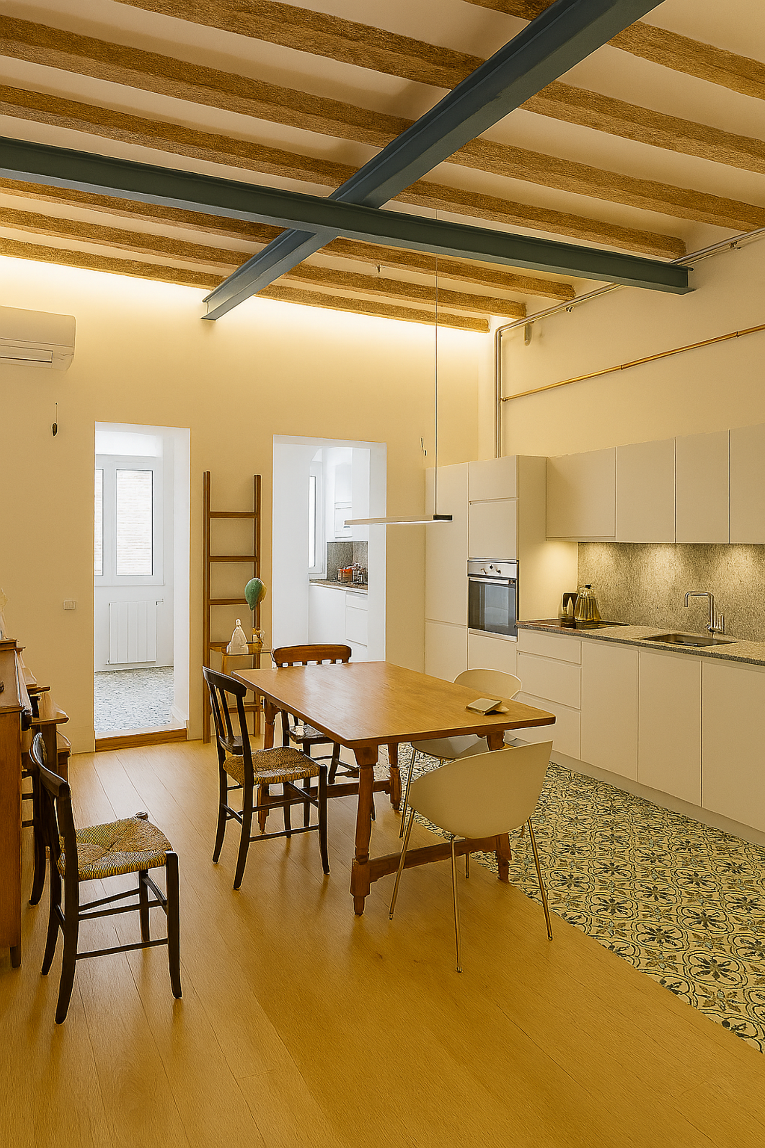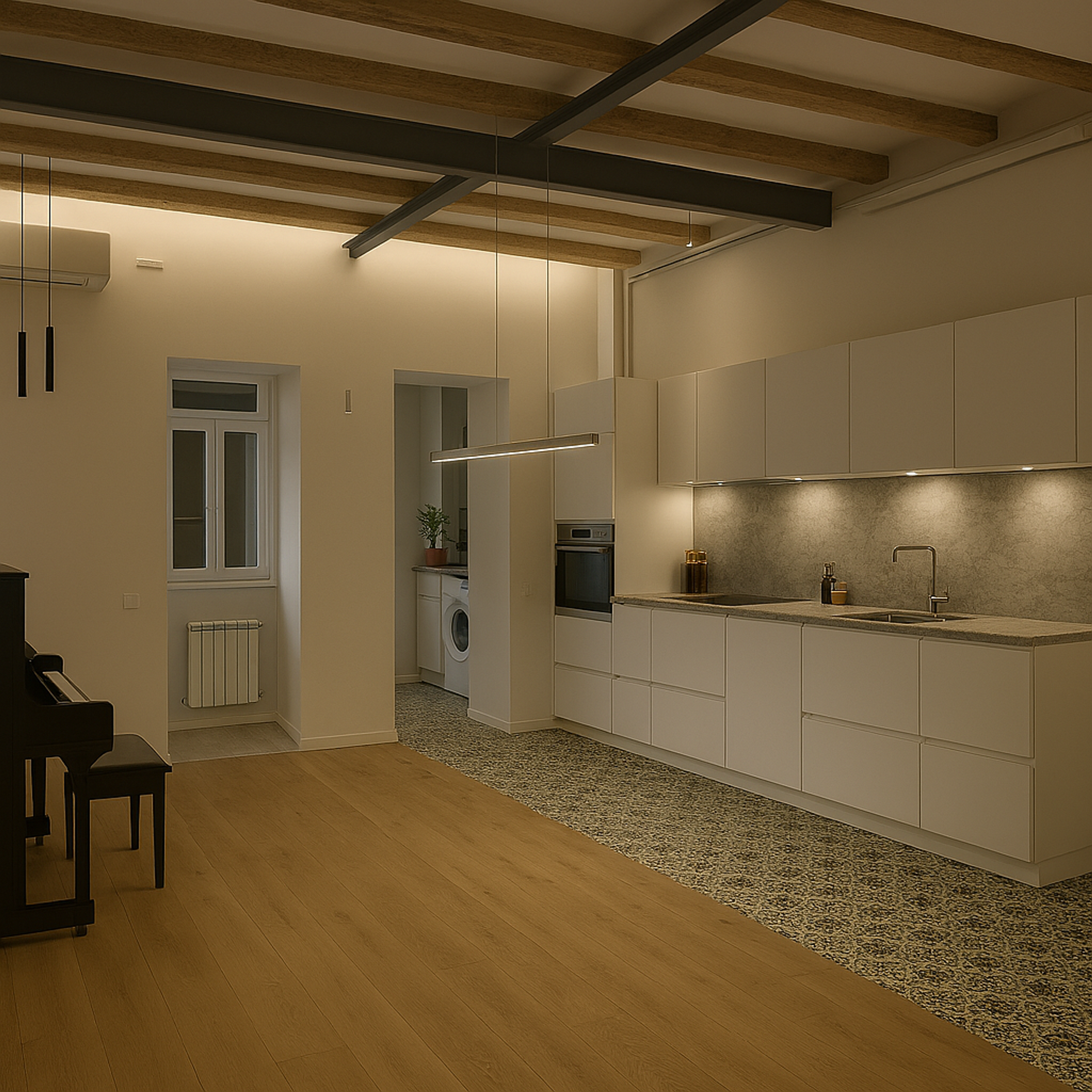 An integral renovation of an 80-square-meter flat from the 19th century in Barcelona. This sustainable project focused on enhancing air circulation and natural lighting while incorporating environmentally friendly and recycled materials such as wood, hydraulic tiles, granite, and PET.