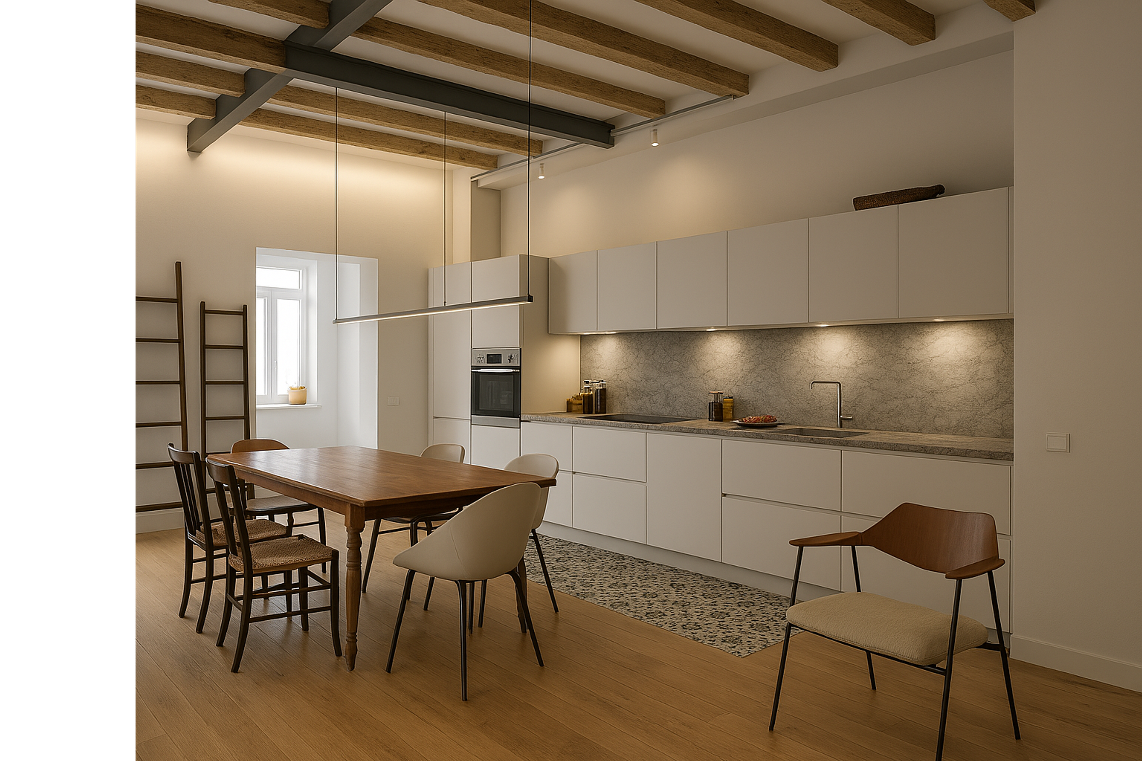 To achieve these goals, some walls and the false ceiling were removed, uncovering the original wooden beams and creating new volumes and openings. These adjustments allowed for improved ventilation and lighting, especially in the central, previously enclosed area of the flat. The kitchen was designed using PET panels made from recycled plastic bottles, adding a contemporary and sustainable touch to the space.